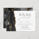 The left-hand edge of this elegant modern wedding RSVP enclosure card features a black watercolor agate border trimmed with faux gold glitter. The title "Kindly Reply" appears in charcoal grey handwriting script, with the remaining text in copperplate and italic fonts on a white background. Includes spaces for your guests to initial their choice of three editable entrees. The reverse side features a matching black and gold agate design.