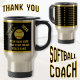 CALL Designer Linda: 239-949-9090 for Colour Changes or Help changing the Black Background and Gold Customisable Text to any colour combinations. These Personalised Softball Travel Mugs with everyone's name on it is a really nice softball coach thank you gift.