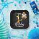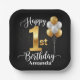 Serve up cake and cheer with this adorable and personalized paper plate, perfect for a 1st birthday celebration. The design features a faux gold number '1' and a festive cluster of metallic gold and white balloons set against a stylish chalkboard black background. These sturdy disposable plates are ideal for your little girl or boy's milestone party. Fully customizable with the child's name!
