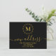 Simple and elegant black background featuring a delicate golden botanical wreath, monogram, with gold typography for new address details.