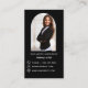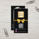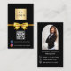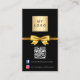 A classic black background. Decorated with a golden bown. Personalise and add your business logo, photo, name, title and contact information. Add your website url/link to the Qr code. With Facebook and Instagram icons. White text.