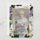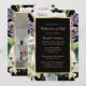 Elegant black and gold floral celebration of life invitation featuring a gold frame adorned with purple flowers, white calla lilies, orchids and greenery. A floral photo frame at the back.