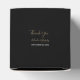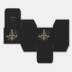 This design features elegant black background with a vintage golden colour chandelier. The damask gold chandelier reflects its shadow contrasting against the black. The combination of the black and gold colours creates a sophisticated, trendy and chic style. Elegant wedding favour box design with modern elements. The simple setup of the typography gives it a distinct style. Matching wedding invitations and other stationery items are also available.