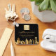 A black background, with a faux gold city skyline as decor. Personalise and add your business logo and a text on front. Golden letters