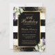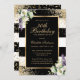 Elegant black and white striped floral 30th birthday invitation featuring a gold frame decorated by gold confetti, calla lilies and greenery.