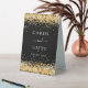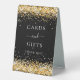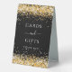 A black background colour. Decorated with faux gold confetti. With the text: Cards and gifts, thank you!