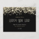 Modern black and gold Happy New Year postcard showcasing confetti and glitter with a modern type font.
