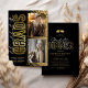 Celebrate the two graduates with these modern graduation dinner invitations featuring photos of the grads, a stylish black background, faux gold glitter, the saying "lets celebrate the grads" in a script and gold neon sign, and a elegant text template that is easy to personalise.