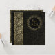 Stylish, modern wedding invitation with black swirling tendrils on dark grey with gold vine scroll border.