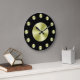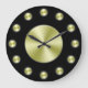 A simple wall clock with a black background, black hands and golden circles to mark the hours and a small golden face. Click Customise It to add your custom text or images, change background colours and more.