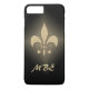 This iPhone 6 Plus case features a gold, metal style Fleur de Lis image on a gradient black and gold background. Personalise with your initials.