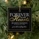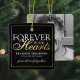 Elegant memorial christmas tree decoration featuring the text "forever in our hearts", their name, birth/death dates, a faux gold border, and the remembrance saying "gone but not forgotten". On the reverse is a photo of the person you are remembering.