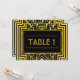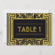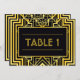 These table numbers feature an intricate geometric frame, geometric patterns, a black and gold colour palette, and other stylistic details all inspired by Art Deco and the roaring twenties. You can customise the sample text fields to your liking.