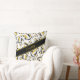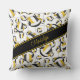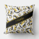 This cute volleyball team colours throw pillow for girls features a pattern of varied size stylised black, gold and white volleyballs turned every which way overlying a volleyball net detail graphic - the volleyballs' black and gold panels are blended with an artsy, girly floral pattern - personalise her name in a sophisticated handwritten font on a bold, angled, full width black colour strip - background and name strip colours are customisable - by katz_d_zynes