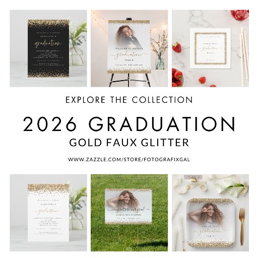 Printable Black Gold Glitter Graduation Invitation. Available digitally and printed. Elegant gold faux glitter confetti borders are at the top and bottom and also on the back. Graduation is set in a modern handwriting style. Easily personalise the rest of the text to your own.