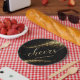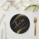 Add your custom touch to a birthday or any other party with these personalised paper plates. Design features modern script calligraphy metallic text "Cheers" and gold coloured confetti on a black background.