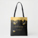 Decorated with happy, smiling bumblebees. A chic black background. Decorated with faux gold glitter drips. Yellow hand lettered script with swashes and the text: Bee Happy. Personalise and add your name.