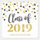Custom name class of 2019 graduation stickers with black and gold glitter print effect confetti pattern and modern hand lettered style text.