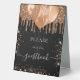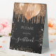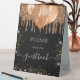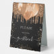Black background. Decorated with dark faux gold glitter drips, dust and golden balloons. With the text: Please sign the guest book.