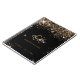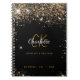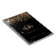 A black background, decorated with faux gold glitter dust. Personalise and add your monogram initials, first name, full name and a title. Golden and white letters.