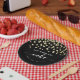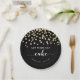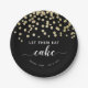 Bold wedding paper plate featuring a black background, large gold glitter confetti dots, and white text. Says "Let them eat cake." Personalise with your own names and date.