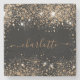 A stylish black background. Decorated with dark faux gold glitter drips and glitter dust. Personalise and add a name. The name is written with a modern hand lettered style script with swashes.