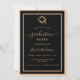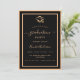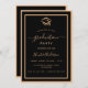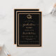 A modern, elegant and invitation. A black background decorated with golden frames and a cap. Personalise and add a name and party details. White text.