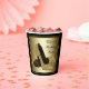 Womans black and gold high heel shoe birthday party paper cups with gold glitter high heel shoes on an elegant black and gold background. You can add the text of your choice to these pretty black and gold paper cups.