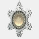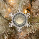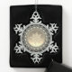 A single perfect ice crystal, set in gradient hues of gold; framed by a laced snowflake design...gives almost a snow globe like effect. The ice crystal is actually a template, allowing you to replace with a photo of your family or winter scene of your choice, should you prefer.