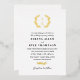 Elegant wedding invitation in a gold foil and black typography design with a laurel wreath monogram and beautiful fonts. Typography wedding invitation with a greenery monogram and beautiful fonts. Monogrammed gold foil wedding invitation with a stylish typography design and greenery.