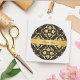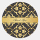 An elegant thank you sticker with a floral damask pattern of lilies in black and gold, with a gold ribbon. Customize the text to use for a wedding or any other occasion.