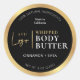 Elegant black and gold round product labels - great to use for cosmetic jars and tins *verify size to ensure a good fit for your jars*. Featuring gold foil effect border and black background with modern serif type and space for your custom logo. Add your scent name and make professional branded stickers for whipped body butter, whipped soap, lotion, cleansers and more!