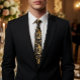 Add a refined touch to your formal look with this black and gold patterned necktie. Rich metallic details and an elegant ornamental design create a timeless, luxurious style perfect for weddings, evening events, and special occasions.
