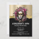 The face of a beautiful woman with porcelain white skin and ruby red lips is wearing a fantasy inspired faux gold eye mask that appears to shimmer and shine. Her long grey hair is decorated with beautiful pink roses and she is set against a black and faux gold metallic shimmer background that has white editable text templates on it for your custom wording. These are ideal for a bachelorette, birthday, sweet sixteen; milestone or quinceanera party. Simply personalise the editable text templates to suit your special occasion.