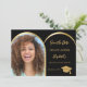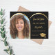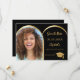 On front: Add your own vertical size photo of the graduate. Faux gold photo arch frame. A black background, golden text. Templates for a name and date. The name and the text: Save the Date are written with a modern hand lettered style script. With a cap, tassel topper.