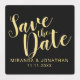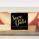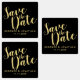 featuring title "Save the Date" in gold modern script font with name and date in modern sans serif font on black background.