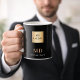 A classic black background. Personalise and add your business logo (3), a name and monogram initials (3). The name is written in white with modern white and golden block letters.