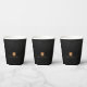 Luxury monogrammed paper cups with a black leather look background and a faux gold copper metallic brushed square with elegant script signature name and monogram initials. ++++++++++++++ Easy to personalise creating your own logo with your business or personal initials and name. +++++++++++++ Could be an elegant personalised business corporate disposable drinkware for a networking event or for office guests or a modern branding essential for your office bar.