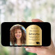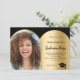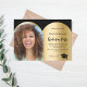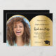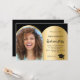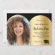Add your own vertical size photo of the graduate. A faux gold arch shaped photo frame. A faux gold and black background colour. Personalise and add a name and party details.