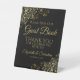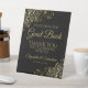 This beautiful wedding tabletop guest book sign is a wonderful welcome for your guests, and will help you direct them to sign your guest book to leave a lasting memory of your special day. It features a simple yet elegant black and gold design with script lettering and lacy golden faux foil curls and swirls in the corners. The sign reads: Please Sign Our Guestbook. Thank You for Celebrating with us! There is room for your names and the wedding date below.