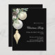 For a Christmas party with family and friends. An elegant, modern black background. Decorated with white and gold baubles and some greenery and a pine cone. Personalise and add the details.