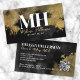 Chic Trendy Makeup Artist Black Gold Monogram Business Card. You can change it to any business you want—makeup artist, lash specialist, hair stylist, or even something like marketing, consulting, and more! Featuring a black background with faux gold watercolor or alcohol ink (a touch of a marble feel) as the backdrop, paired with white bold typography and an elegant script font for the details. The back includes space for a QR code so customers can quickly connect to your website. A trendy and chic look that stays professional and elegant.