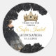 Add a touch of elegance to your Quinceañera party favors with this stunning personalized round sticker. Featuring a sophisticated design of a girl in a royal black gown, framed by luxurious black roses and a majestic gold crown, this sticker is the perfect way to say "Thank You" to your guests.