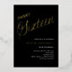 A modern Sweet 16 invitation. Classic black background and the word Sixteen written with large letters in faux gold. Personalise and add a name and party details. White text.