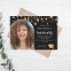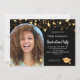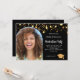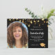 Add your own vertical size photo of the graduate. An arch shaped photo frame. A classic black background colour, decorated with faux gold stars. Personalise and add a name and party details.