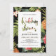 This unique tropical bridal shower invitation features a beautiful tropical floral pattern with a stylish typography.