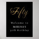 A welcome board for a 50th birthday party. Black background. Fifty writen with large golden hand lettered style script. Personalise and add a name.