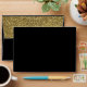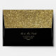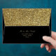 Simple, luxury, modern, chic gold glitter and black 5x7 envelope with return address and elegant calligraphy script.