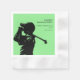 This bachelor party napkin design features a grass green background with a striking black silhouette of a golfer. The mood of this design is one of camaraderie and adventure, promising a memorable and enjoyable bachelor party experience. This napkin is for a bachelor party event, a golf-themed getaway. It's a chance for the groom and his closest friends to enjoy a day on the golf course followed by evening festivities, celebrating the groom's upcoming wedding in style. Perfect for golfers, this will be an ideal way to create lasting memories. Perfect for golf enthusiasts and those who enjoy outdoor activities. The napkin is designed to appeal to the audience, promising an unforgettable bachelor party experience filled with fun, laughter, and camaraderie.
