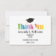This is a simple and modern design with a black graduation cap, yellow gold tassel, black text and white background. Colourful "Thank you” image. Yellow gold is printed colour, not metallic foil.